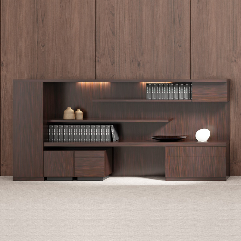 這款實(shí)木文件柜外觀簡(jiǎn)潔但形態(tài)結(jié)構(gòu)卻優(yōu)美高端,講究的線條的審美性,線條部分與整體之間和各部分之間融合恰當(dāng)。抽按彈抽落地柜;配優(yōu)質(zhì)阻尼鉸鏈;實(shí)現(xiàn)開(kāi)關(guān)靜音,照明系統(tǒng)配置在衣柜中在辦公家具中其實(shí)并不多見(jiàn),而這款文件柜衣柜內(nèi)配置1 個(gè)LED 冷光衣桿燈,;開(kāi)放區(qū)頂板配置1 個(gè)610MM 長(zhǎng)的LED 冷光燈,手掃感應(yīng)開(kāi)關(guān)非常方便。
